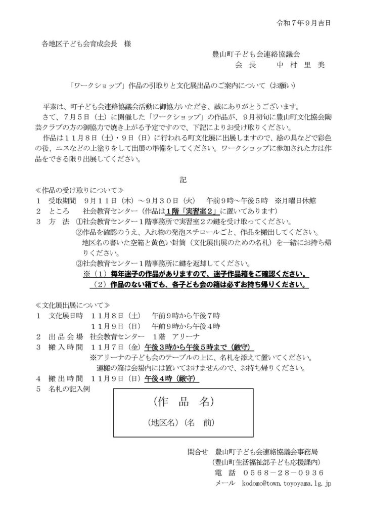 つきましては、作品の引取りと完成、文化展出品までのご案内を下記に記しますので、よろしくお願いいたします。