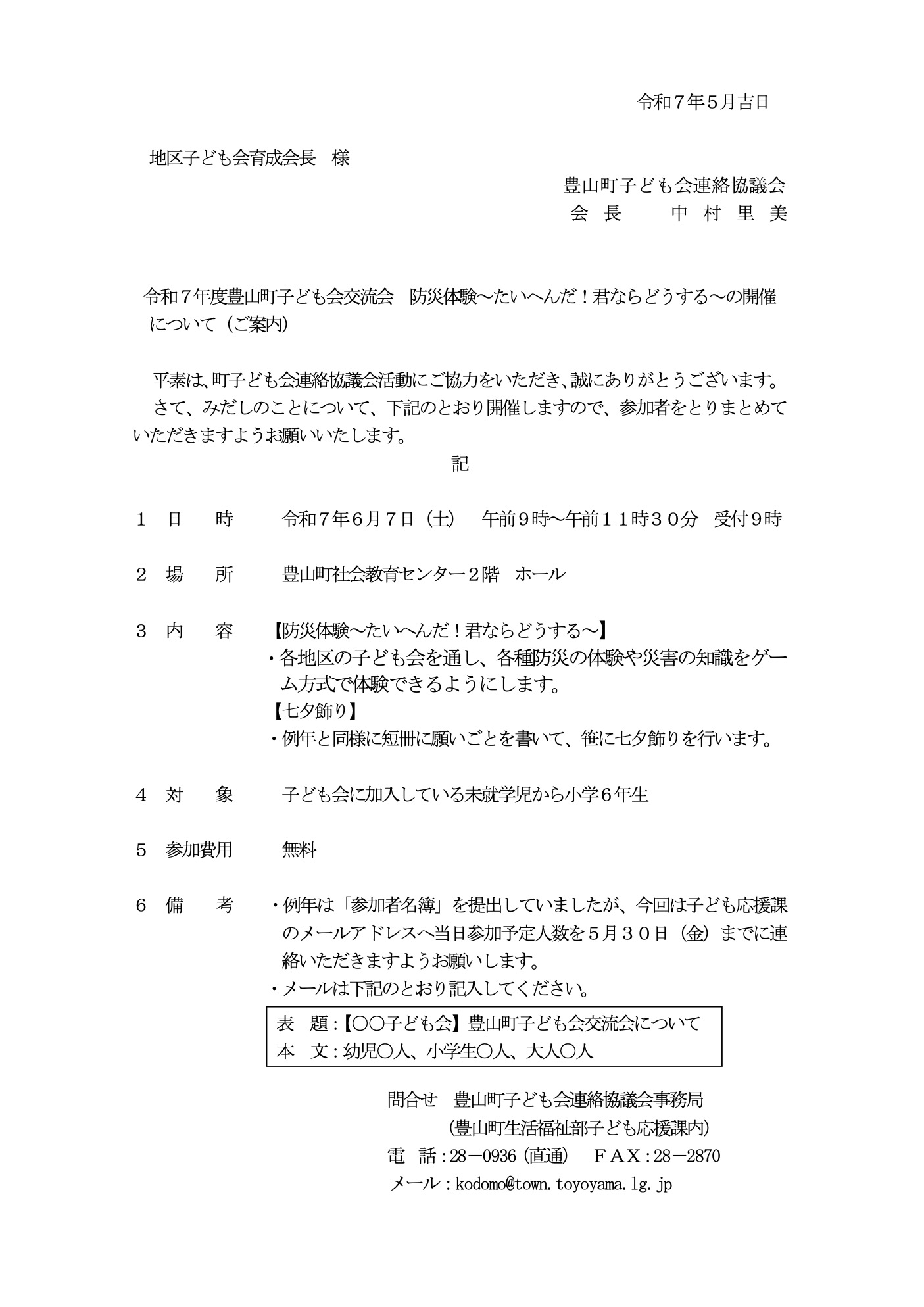 日ごろは子ども会事業にご理解とご協力をいただき、厚くお礼申し上げます。 令和7年度豊山町子ども会ワークショップを開催します。 案内文を下記へ貼り付けますのでご確認ください。 ご質問等ございましたら、豊山町役場 子ども応援 […]