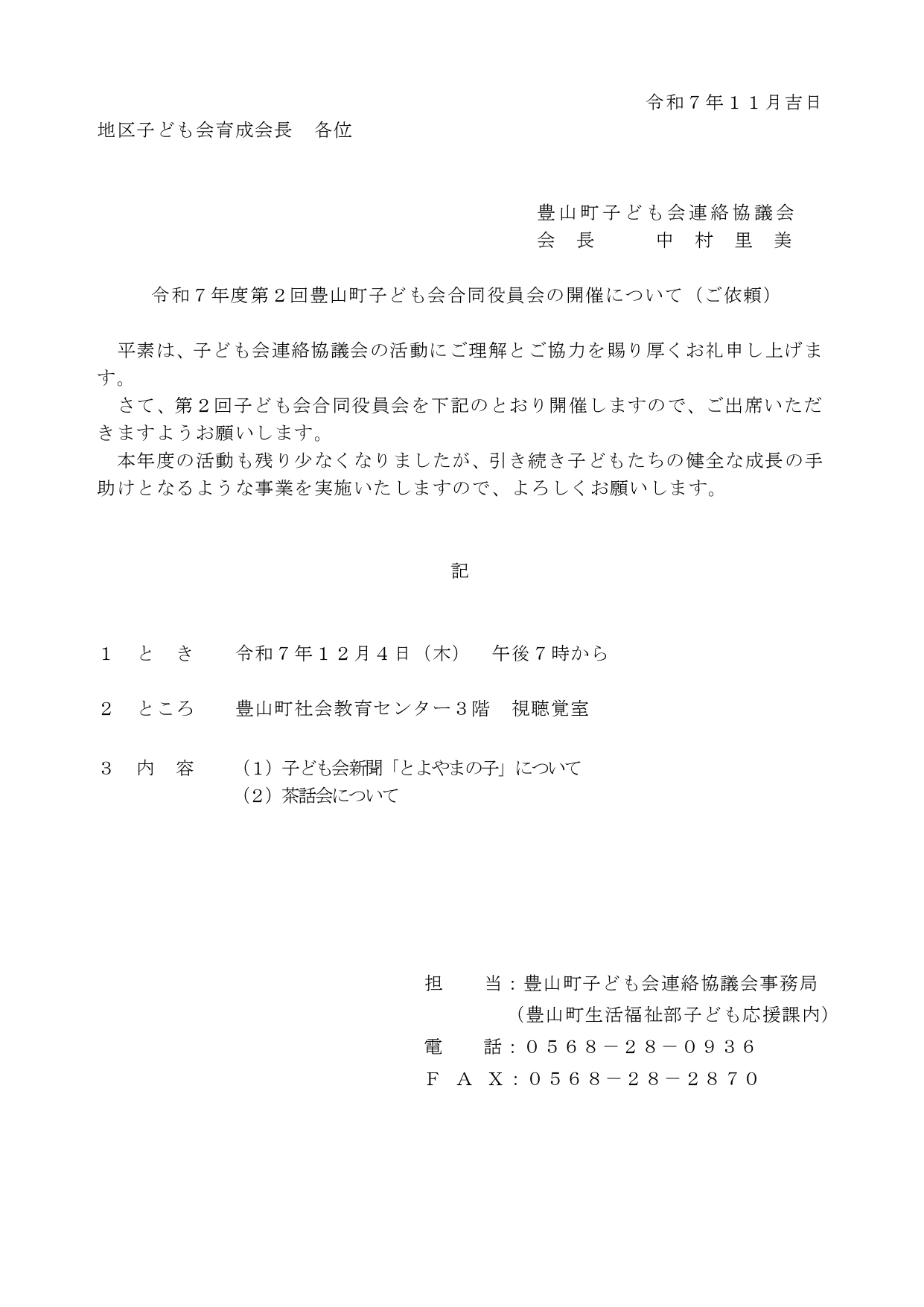 平素は、子ども会連絡協議会の活動にご理解とご協力を賜り厚くお礼申し上げます。 下記日程にて合同役員会を開催いたしますので、ご出席頂きますようお願い申し上げます。 日程:令和7年12月4日(木) 午後7時から 場所:豊山町 […]